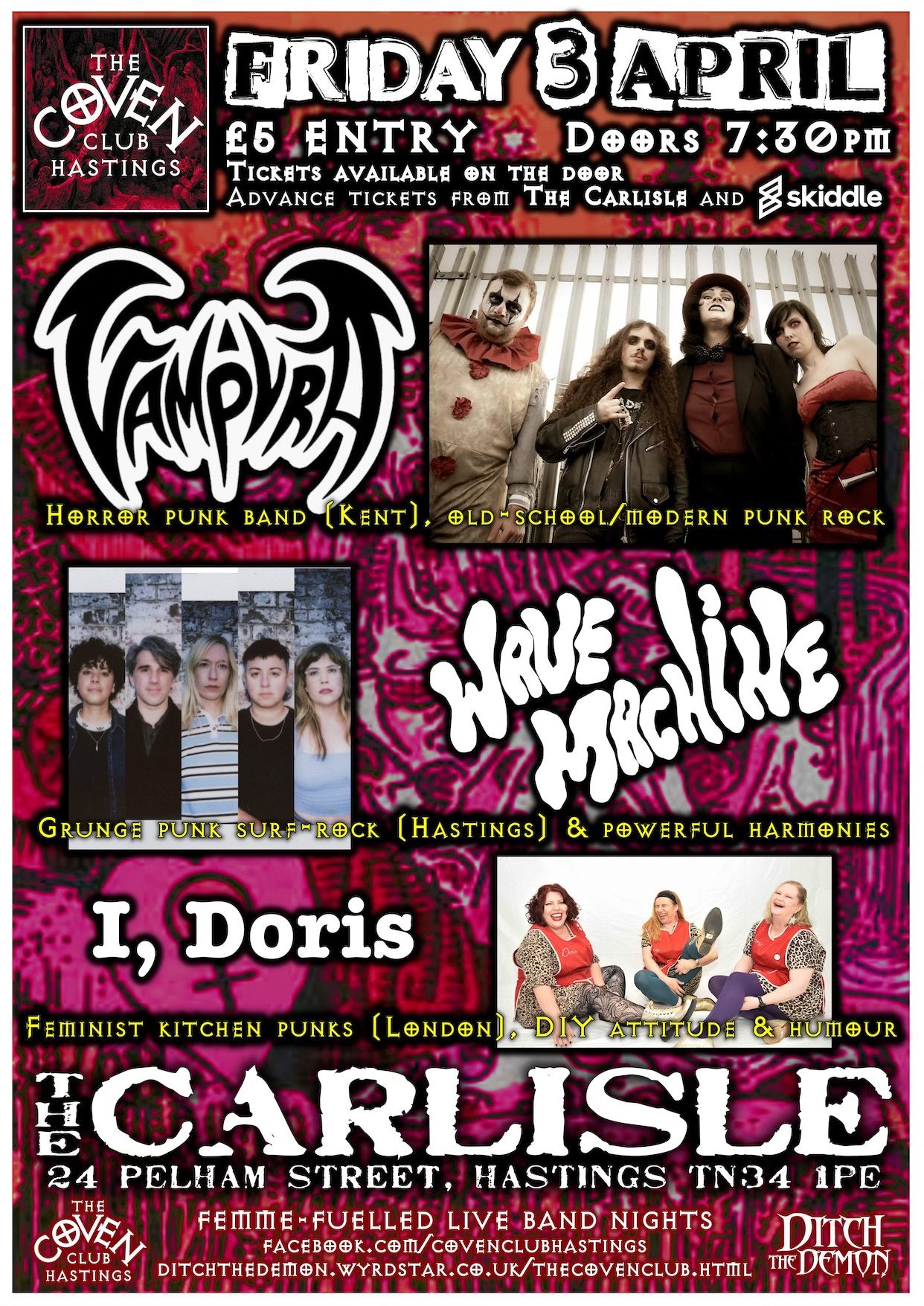 The Coven presents oestrogen-fuelled live music night - featuring horror-punks VAMPYRA, surf-grunge WAVE MACHINE and feminist kitchen-punks I, DORIS. This is a ticketed event.